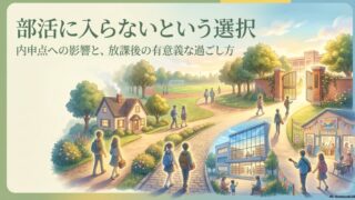 部活 部活に入らない子の特徴とは?内申点への影響と有意義な過ごし方 中学生や高校生で部活に入らない選択をする子どもが増えています。この記事では、部活入らない子の特徴や背景を詳しく解説し、親が心配する高校受験の内申点への影響を客観的にまとめました。さらに、部活入らない子の特徴を活かした有意義な放課後の過ごし方や、親の正しい接し方も紹介します。 部活